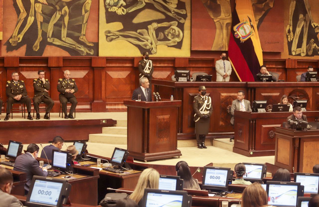 Quito, 19 de mayo de 2022.- Al mes y medio de iniciada su gestión, el ministro del Interior, Patricio Carrillo, compareció ante el Pleno de la Asamblea Nacional para informar sobre las acciones emprendidas por el Ministerio del Interior y la Policía Nacional con el fin de mitigar y contener riesgos y amenazas a la seguridad ciudadana, priorizando el derecho a la vida.