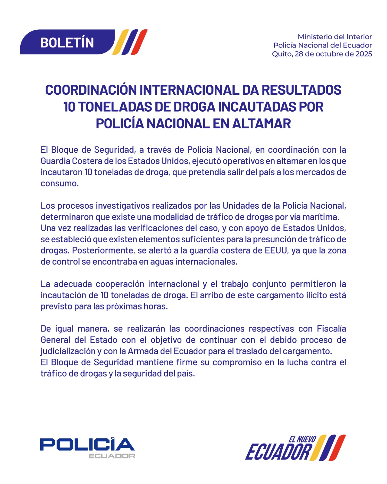 El Bloque de Seguridad, a través de Policía Nacional, en coordinación con la Guardia Costera de los Estados Unidos, ejecutó operativos en altamar en los que incautaron 10 toneladas de droga, que pretendía salir del país a los mercados de consumo.