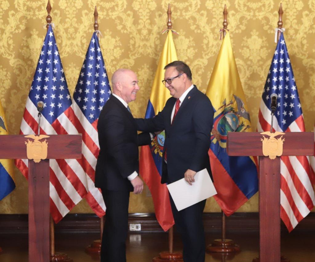 El ministro del Interior, Juan Zapata, se reunió la tarde de este miércoles con el secretario del Departamento de Seguridad Nacional de los EE.UU., Alejandro Mayorkas, el presidente de la República, Guillermo Lasso, y varios ministros de Estado para tratar temáticas vinculadas al crimen organizado, estructuras criminales dedicadas al tráfico de drogas, armas y explosivos, así como a la trata de personas.