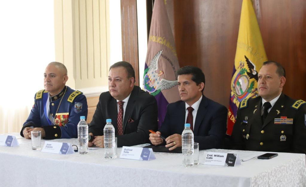 El ministro del Interior, Juan Zapata, en compañía del comandante de la Policía Nacional GralD. Fausto Salinas y el director del ECU 911, Bolívar Tello, durante rueda de prensa dieron los detalles del operativo que realizará la Policía Nacional el próximo domingo 5 de febrero durante las elecciones seccionales, vocales del Consejo de Participación Ciudadana y Control Social (Cpccs) y Referéndum 2023.